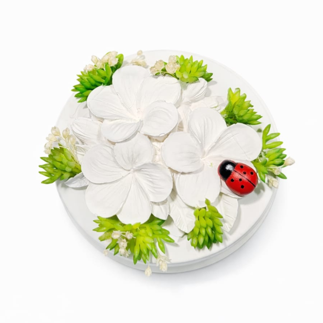 Cette boîte est ornée d’une fleur en résine minérale, délicatement décorée de fleurs séchées naturelles, pour une création à la fois poétique et raffinée.