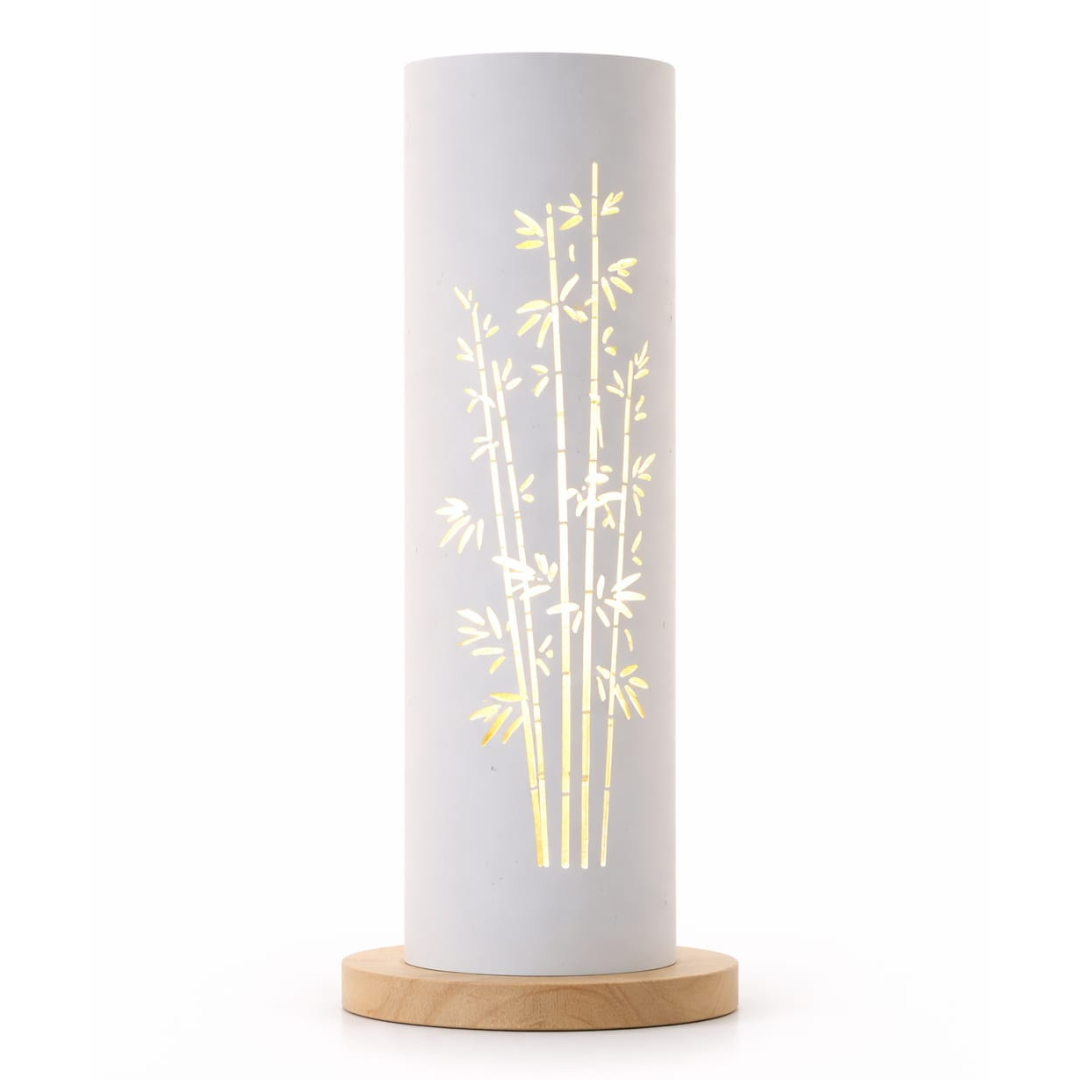 Lampe en tube PVC sur socle en bois brut, entièrement fait main.