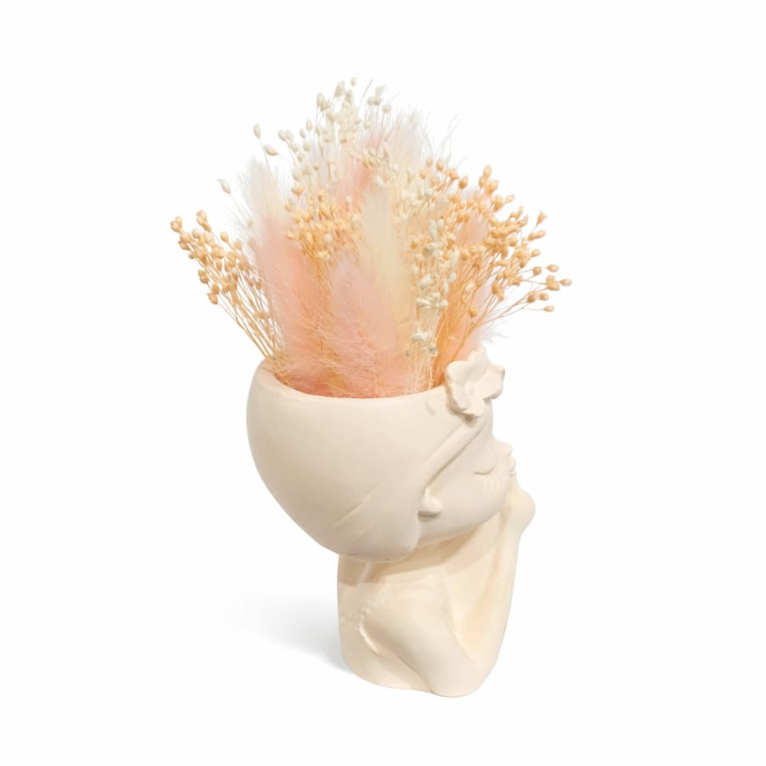 Ce petit pot décoratif en résine minérale, représentant un visage féminin orné de fleurs séchées posées sur la tête, apporte une touche délicate et poétique à votre intérieur.
