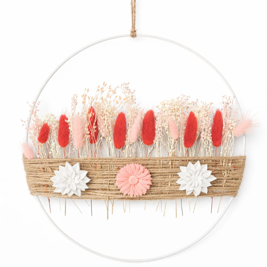 Cette suspension décorative associe la douceur des fleurs séchées naturelles à l’élégance de fleurs en résine minérale parfumables, pour créer une décoration à la fois esthétique et sensorielle.