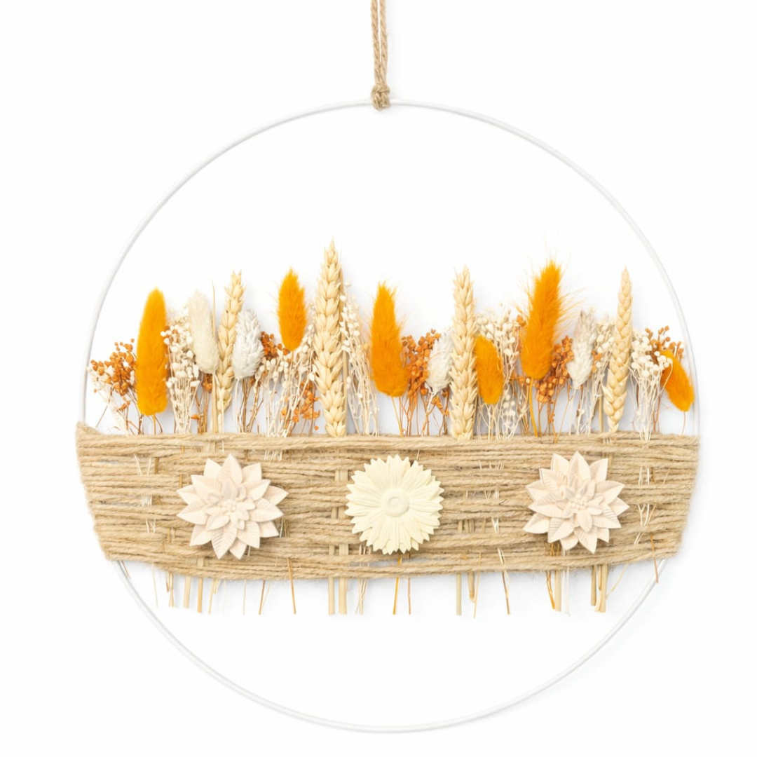 Cette suspension décorative associe la douceur des fleurs séchées naturelles à l’élégance de fleurs en résine minérale parfumables, pour créer une décoration à la fois esthétique et sensorielle.