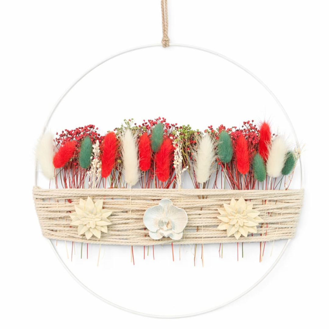Cette suspension décorative associe la douceur des fleurs séchées naturelles à l’élégance de fleurs en résine minérale parfumables, pour créer une décoration à la fois esthétique et sensorielle.